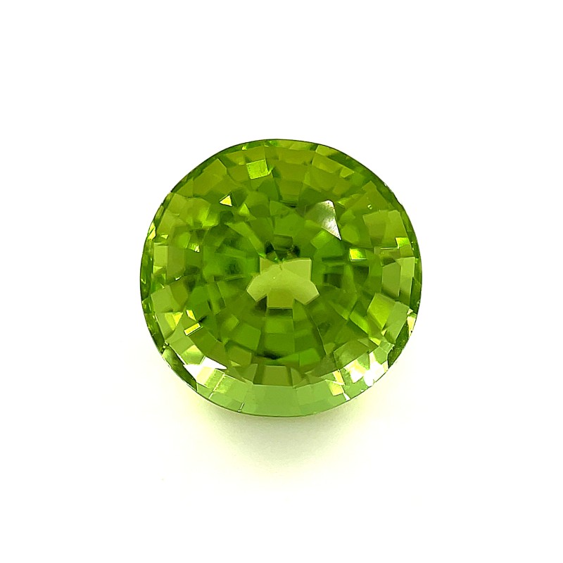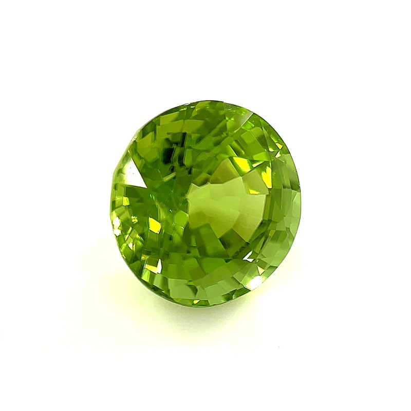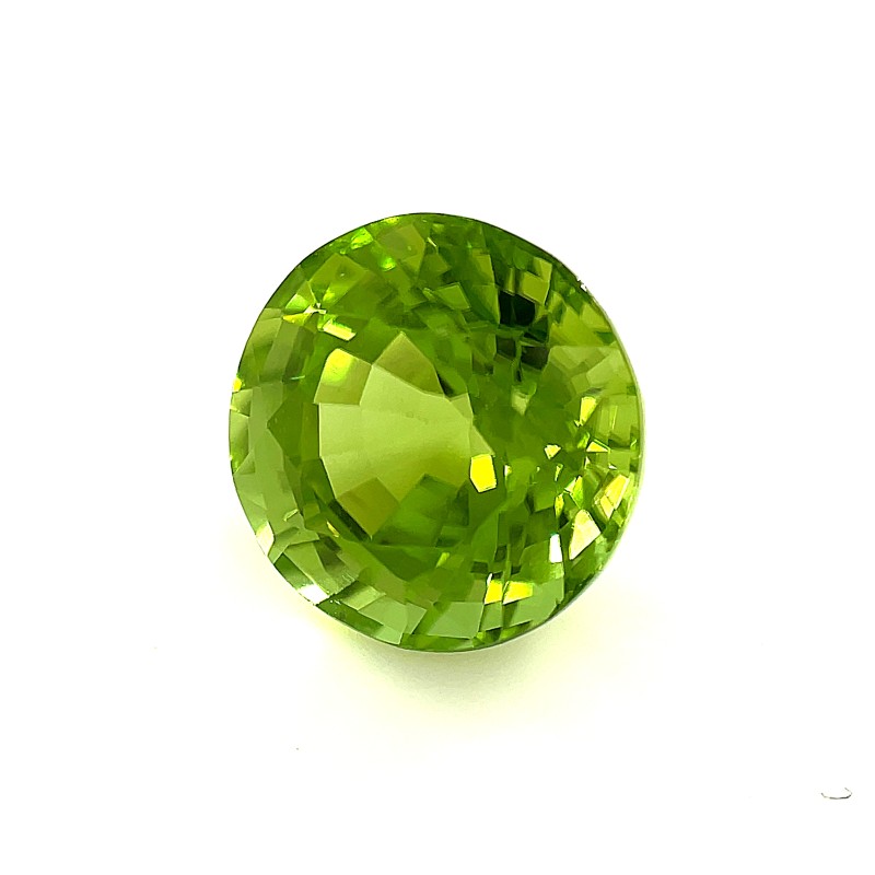 This gemstone is a loose peridot gemstone. It is faceted, round, and has a beautiful green color. It weighs 5.56 carats with a size of 10.2 x 10.2 x 10.2mm. The peridot is popular for its brilliant green color and is the birthstone for the month of August.